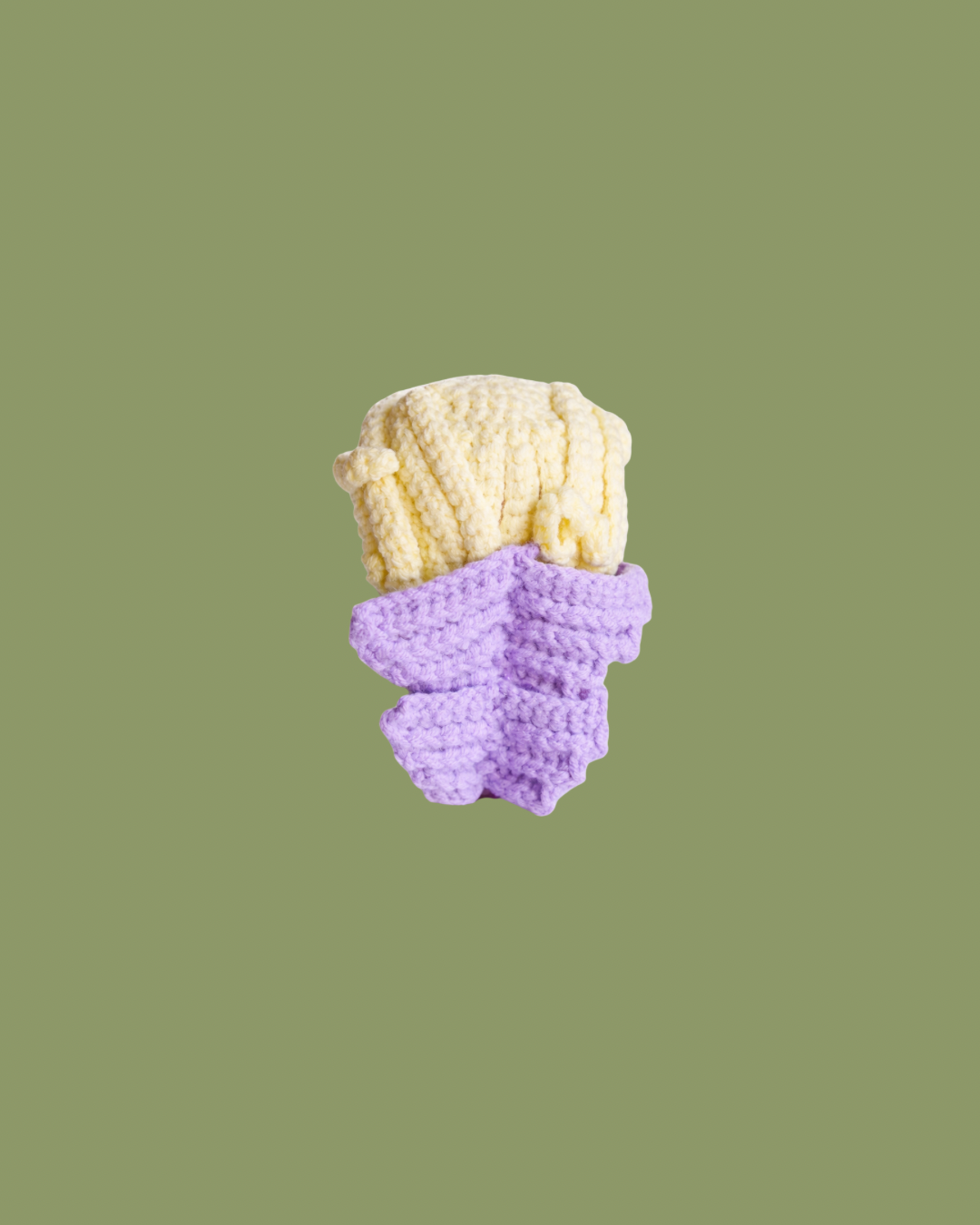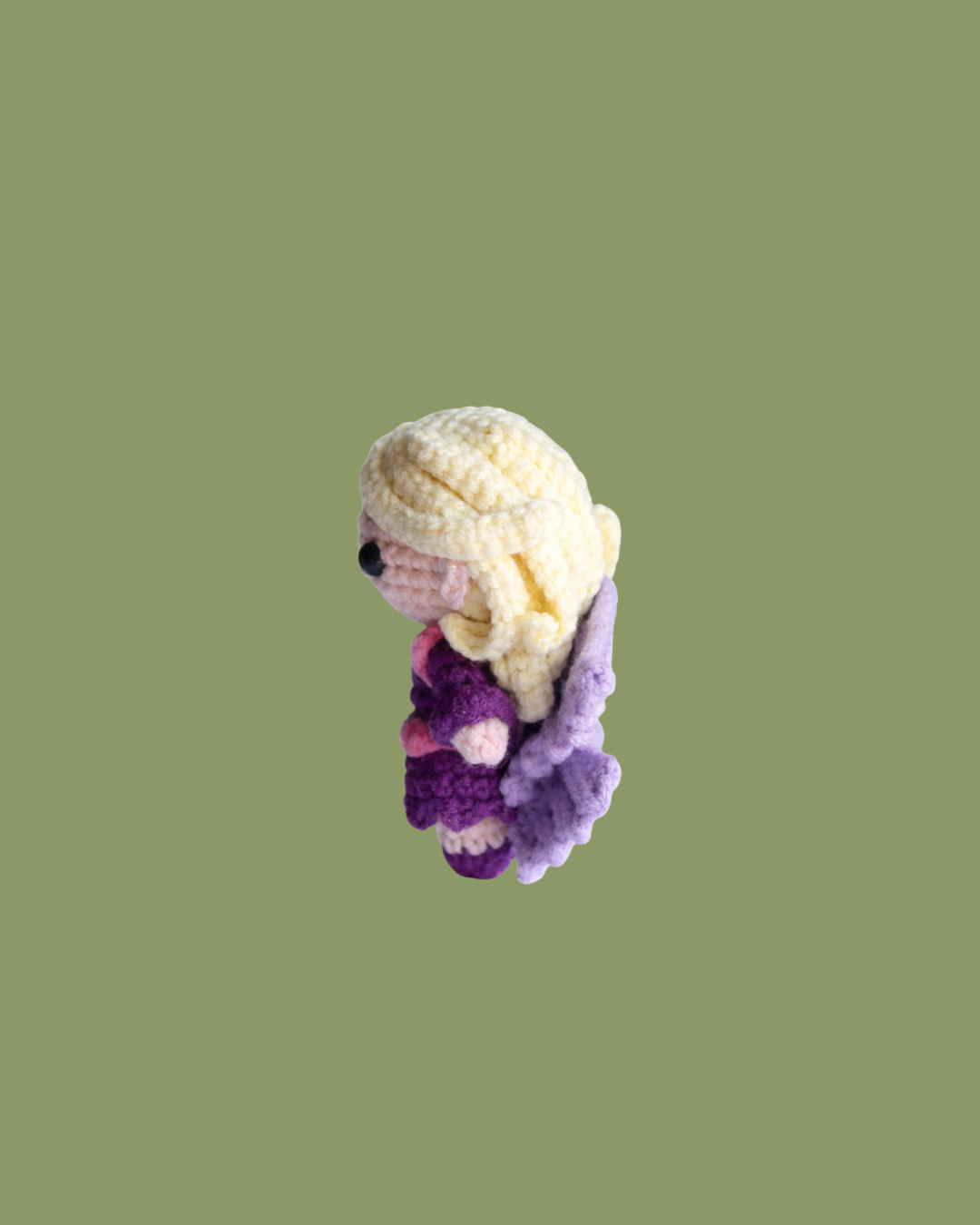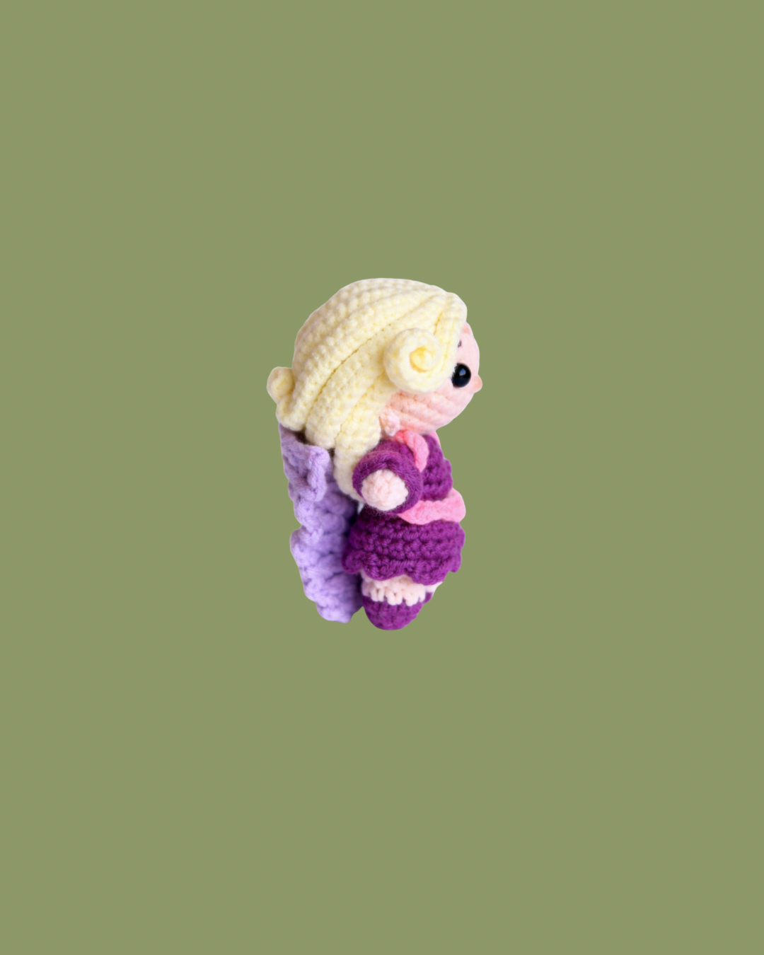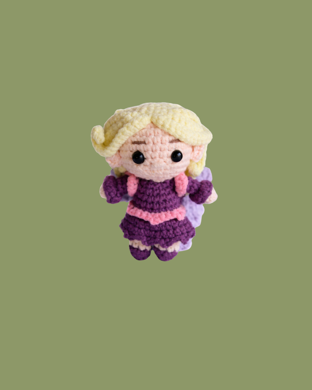 Each doll is lovingly crocheted with intricate detail — from her soft golden curls to her twinkling purple dress and tiny shoes — making her a perfect companion for imaginative play, holiday decor, or a meaningful gift for little dreamers.
